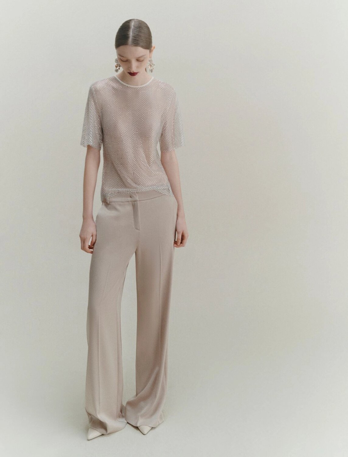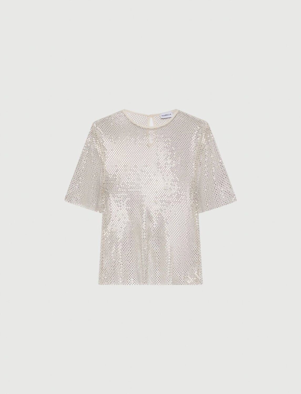 Lasciati sedurre dalla sfavillante leggerezza della t-shirt con strass. Trasparente, ha linee essenziali e apertura a goccia sul collo per completare i tuoi party look con un capo senza stagioni.