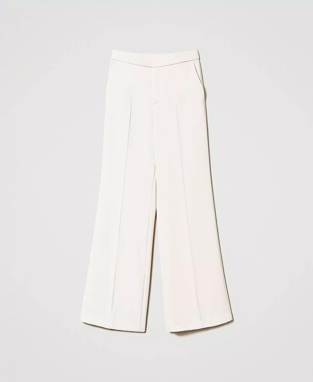 Pantaloni wide leg in crêpe fluido con vita regular, chiusura con zip e gancio a uomo, tasche alla francese, piega stirata.