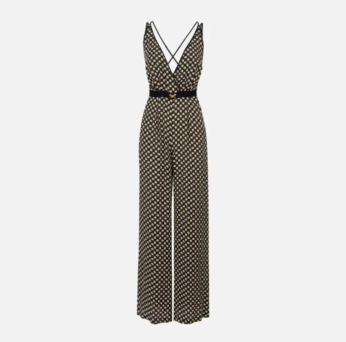 Tuta in georgette con scollo a portafogli e pantaloni a palazzo. Si distingue per la stampa all-over con motivo di rombi che dona movimento al fit. La cintura sottolinea il punto vita ed è illuminata dal fiocco gioiello con logo. Vestibilità slim.