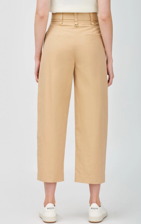Pantaloni a vita alta, in gabardine misto cotone, con chiusura con lampo e bottone a vista effetto corno con Oval T dorato, cintura staccabile. Hanno la gamba morbida con piega stirata e risvolto, tasche asimmetriche applicate davanti, tasche a filetto sui fianchi, maxi tasche applicate dietro. Linea morbida.