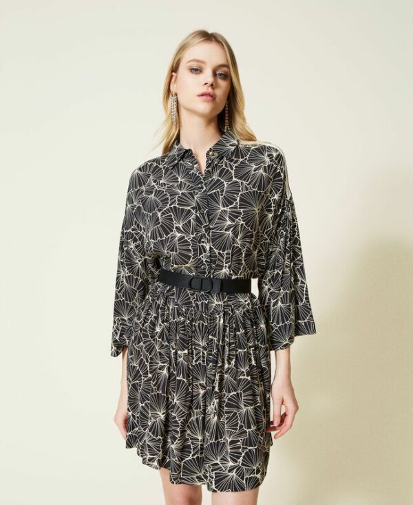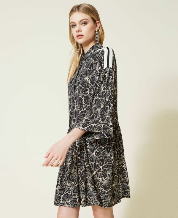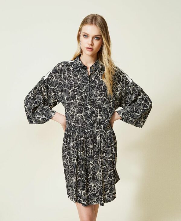 Abito corto chemisier in crêpe di viscosa con stampa foglia ginkgo, righe intarsiate sulle spalle, balza arricciata.