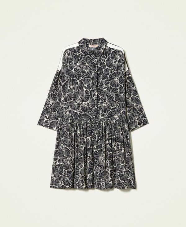 Contaminazione di stili per labito corto chemisier in crêpe di viscosa con disegno esclusivo Twinset nato da unelaborazione grafica monocolore della foglia di ginkgo. Linea ampia e femminile, collo a camicia, maniche lunghe con spalle intarsiate da righe dispirazione sporty, chiusura con bottoni, gonna con balza arricciata. Un capo jolly e di personalità da indossare day-to-night.