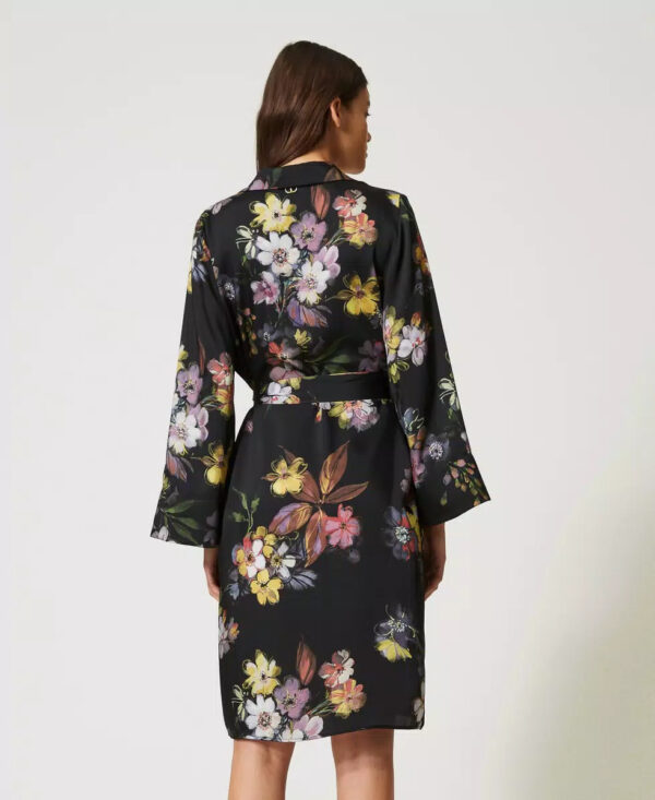 Abito corto chemiser in twill a stampa floreale con collo a camicia, bottoni in tinta, maniche a kimono, linea dritta, cintura abbinata.
