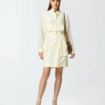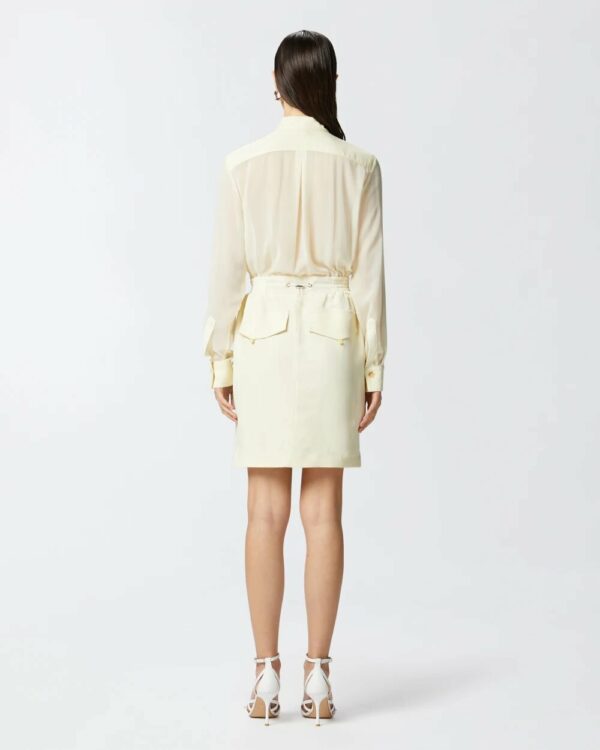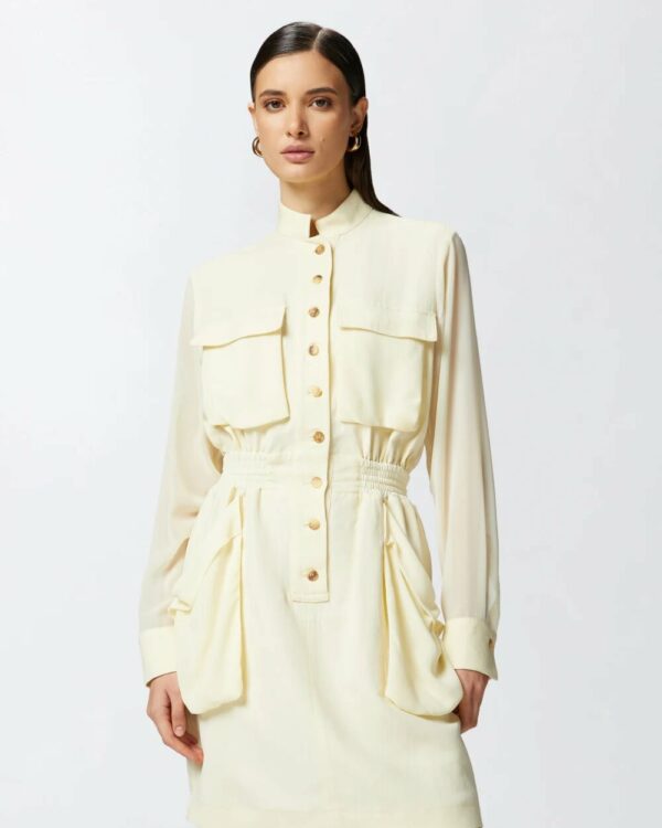 Mini abito chemisier in leggero tessuto di lino e viscosa con maniche lunghe in georgette semitrasparente, con polsino al fondo. Il vestitino da giorno è completato da colletto in piedi e doppia coppia di tasche applicate, sia davanti che sui fianchi, che aggiungono un dettaglio di ispirazione utility. L'abito corto è rifinito con elastico inserito in vita con coulisse regolabile sul retro, per personalizzare la vestibilità del capo a seconda delle tue preferenze. Chiusura con bottoni davanti. Raffinato, femminile e contemporaneo, questo abito corto è ideale per creare un outfit da giorno con un twist speciale.