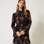 Esprimi il tuo lato più romantico con labito corto in crêpe di viscosa italiano stampato con disegno esclusivo Twinset che unisce pois all over e una fantasia bouquet che attinge alla tradizione dei giardini botanici inglesi. Linea dritta, collo tondo, maniche morbide con volant arricciati al fondo, chiusura con bottoni ricoperti e apertura a goccia sul retro, sfoderato. Lo puoi indossare con o senza la cintura in coordinato. Perfetto per unoccasione speciale completato da pochette e bijoux scenografici.