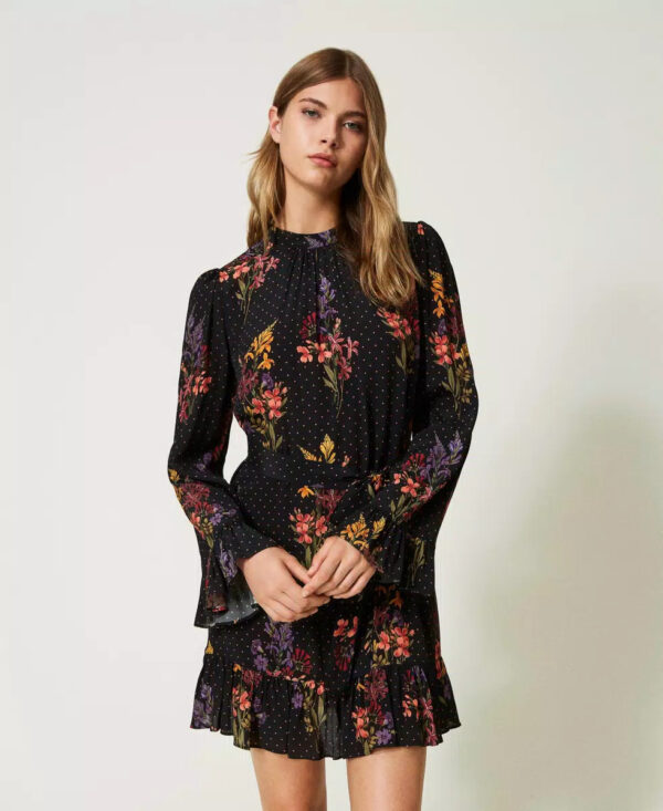Abito corto in crêpe di viscosa con stampa bouquet e pois, collo tondo, maniche lunghe con volant, cintura in coordinato.