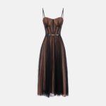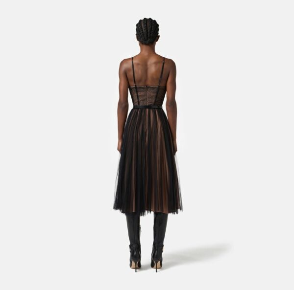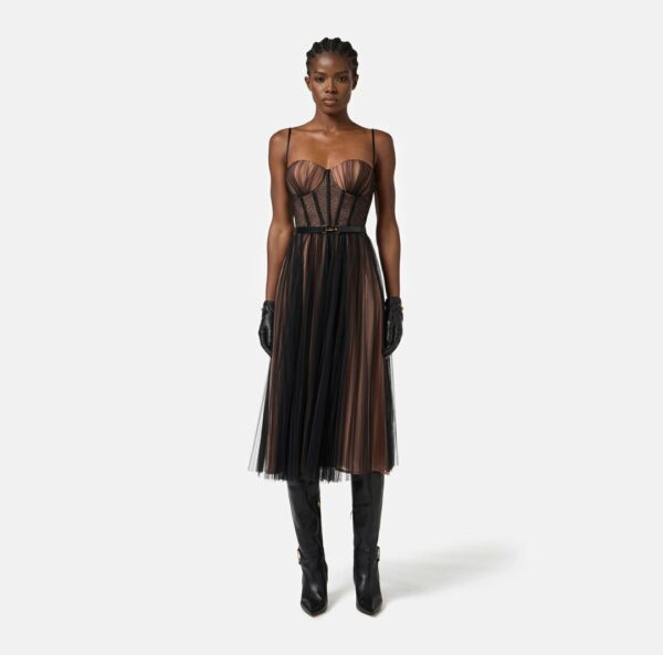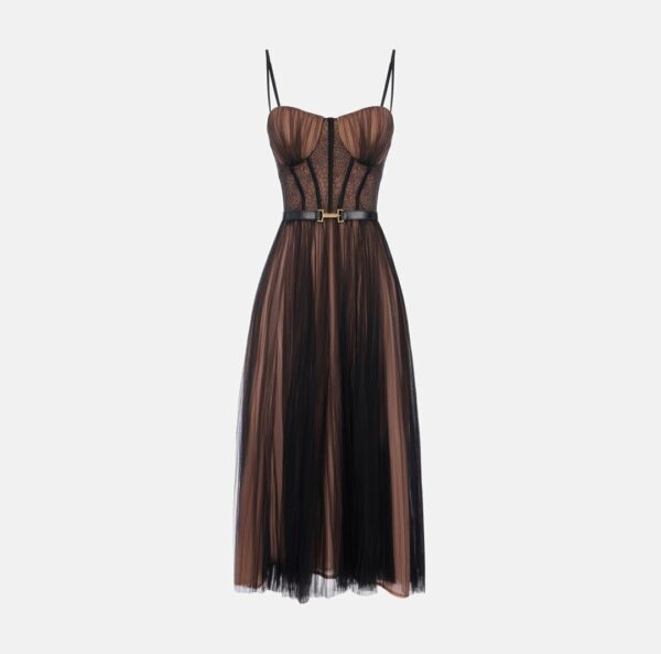 Abito in tulle dalla vestibilità slim. Il vestito ha spalline sottili e si distingue per la costruzione con top a bustier che lascia intravvedere una fantasia di ispirazione snake. Protagonista è la gonna midi con design a ruota e pieghettatura plissé a donare movimento. La cintura sottolinea il punto vita.