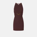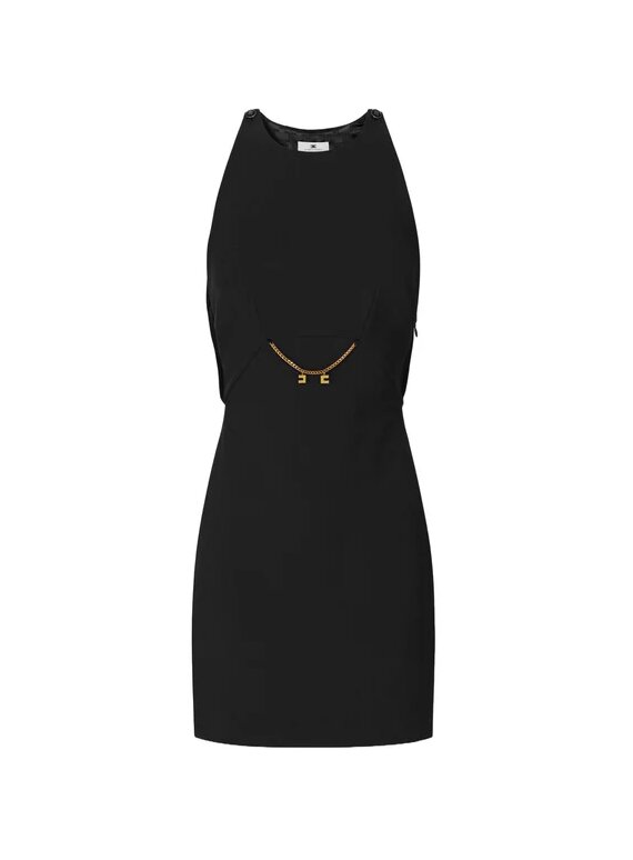 Abito in doppio crêpe dalla vestibilità aderente. Il vestito è smanicato con taglio impero e si distingue per i dettagli preziosi come i bottoni smaltati sullo scollo all'americana e la catena con charms. Il retro in georgette ha volumi balloon trattenuti al punto vita, per un tocco di leggerezza.