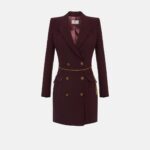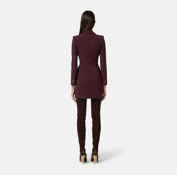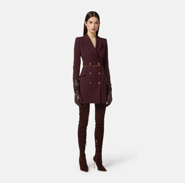 Abito robemanteau in crêpe leggero. Ispirato all'iconico blazer, il vestito ha spalle strutturate, rever a lancia con abbottonatura doppiopetto, patte applicate. I dettagli preziosi come i bottoni e la cintura in catena con logo e nappina in trama snake aggiungono movimento e luce. Vestibilità aderente.
