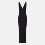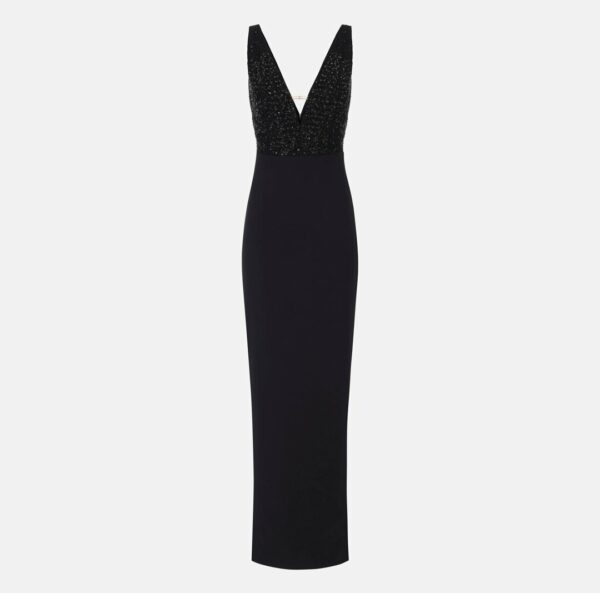 Abito da sera in georgette dalla vestibilità slim. Il vestito è smanicato con scollo profondo, impreziosito dal dettaglio gioiello con logo. Il top è arricchito da cristalli ricamati che regalano luce, la gonna in crêpe ha linea a colonna e profondo spacco laterale per un andamento audace.
