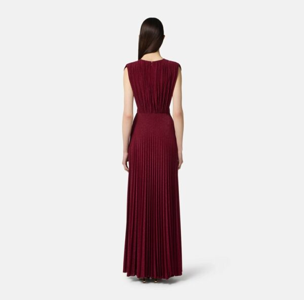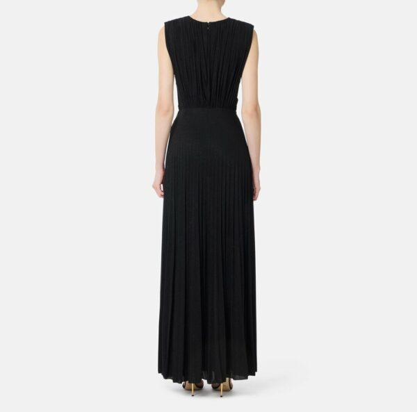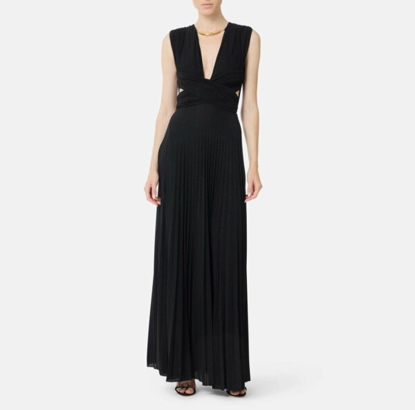 Abito da sera in jersey lurex. Il vestito si distingue per la pieghettatura plissé, esaltata dai drappeggi incrociati sul punto vita. La gonna si apre in uno spacco laterale che dona un andamento sinuoso. Completa il capo la collana con elementi tubolari e logo, amovibile, a illuminare lo scollo.