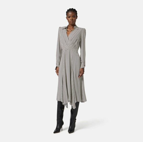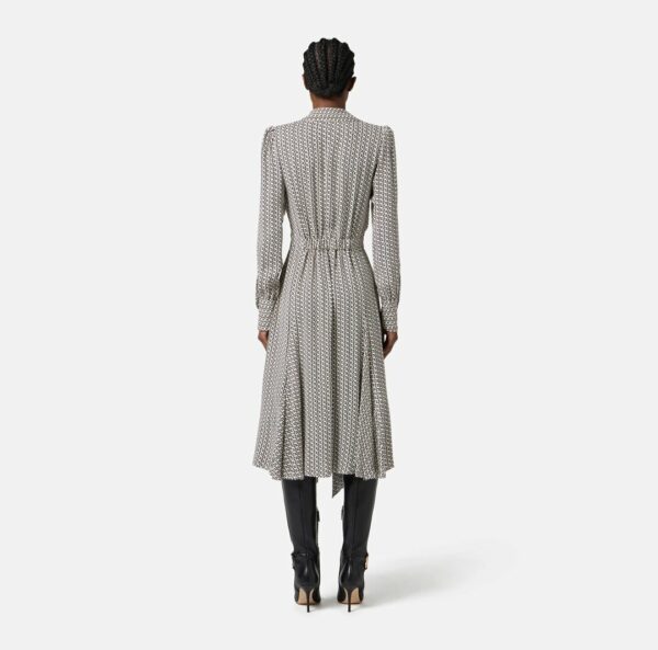 Abito chemisier in georgette dalla vestibilità slim. Il vestito ha collo a camicia con scollo a V incrociato, maniche con polsi asimmetrici, gonna con spicchi ad esaltare la linea svasata. La collana amovibile a elementi tubolari con logo e la stampa geometrica donano luce e movimento.