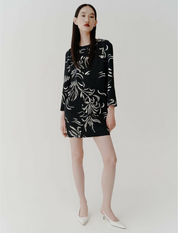 Versatile e subito chic, l'abito corto in satin gioca con la stampa foliage e lascia scoperte le gambe. Perfetto per un city look da completare a piacere. Il capo fa parte della capsule seasonless Marella ART.365.