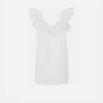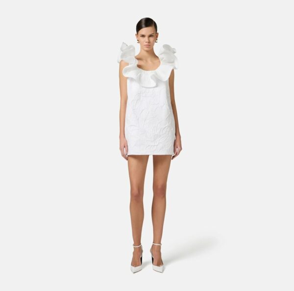 Abito in jacquard. Il vestito si distingue per il frizzante scollo con ruche che decora il davanti e il retro del capo mentre i motivi floreali sono resi da un'elegante lavorazione in rilievo, che dona ulteriore movimento. Vestibilità over.