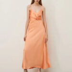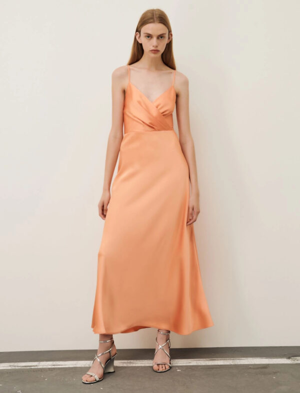 Un'allure romantica caratterizza l'abito lungo in satin dallo scollo a V incrociato e dalla linea fit & flare che valorizza la silhouette femminile. Perfetto per le occasioni speciali.