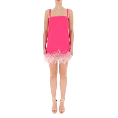 Abito corto senza maniche stile slipdress in tessuto crêpe stretch. Linea dritta, con spalline sottili, scollo squadrato e fondo capo profilato con piume in tono colore. Chiusura con zip invisibile nel centro dietro.