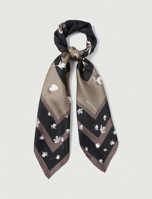 Forme geometriche e una cascata di fiori: il nuovo foulard condensa in una grafica luminosa la nuova femminilità urbana. In pura seta per un accessorio che attraversa le stagioni.