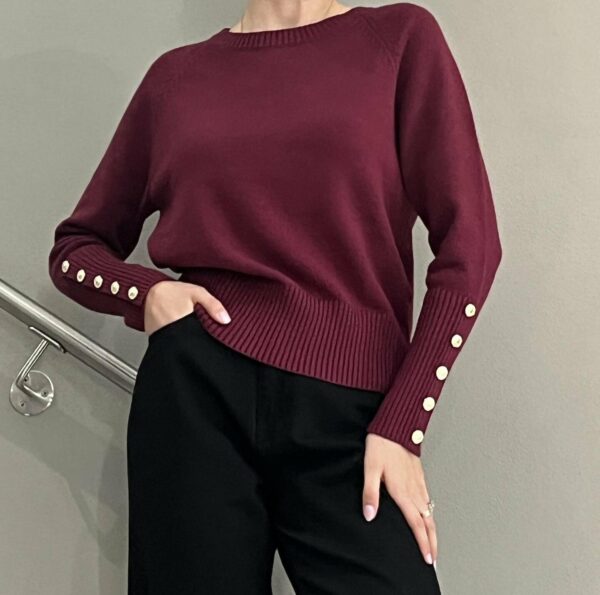 Elegante e ricca di dettagli, questa maglia presenta i polsini alti a costine, impreziositi da bottoni gioiello e maniche lunghe raglan. Il capo presenta scollo rotondo e vestibilità regolare
