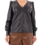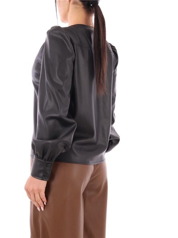 Modello con scollo a V realizzato in similpelle, presenta manica lunga con arricciatura e polsini con bottone. Logo oval T applicato sul dietro.
