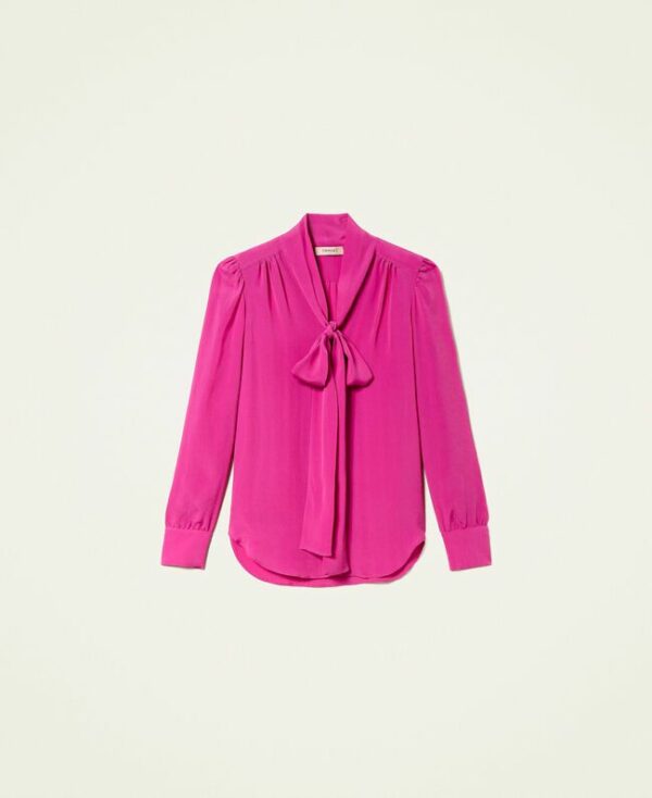 Blusa in crêpe de Chine misto seta, con collo a fiocco, spalle con arricciatura, polsi con bottoni, linea morbida.