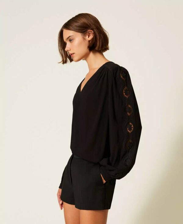 Blusa in crêpe leggero di viscosa con ricamo geometrico su scollo e carré. Ha scollatura a V, spalle con arricciatura, maniche lunghe con ricamo floreale traforato, linea morbida.