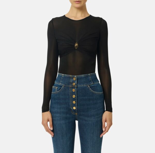 Body in jersey dalla vestibilità aderente. Ha girocollo e maniche lunghe. Si distingue per il drappeggio centrale trattenuto dalla placca gioiello smaltata, impreziosita dal pattern di ispirazione snake.
