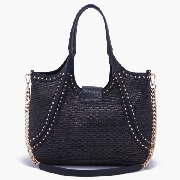 borsa shopping morbida in pelle e raffia, con doppi manici e tracolla rimovibile.
