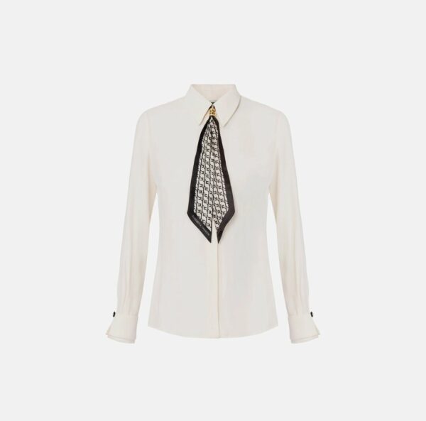 Camicia in georgette dalla vestibilità slim. Il colletto è arricchito dal foulard con stampa geometrica, trattenuto dal passante gioiello con logo. I polsi hanno bottoncino a contrasto e doppio strato in organza che crea raffinate trasparenze.