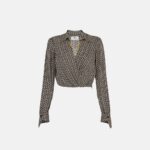 Camicia cropped in georgette dalla vestibilità slim. Ha collo a camicia con scollo a V incrociato, maniche lunghe con polsi asimmetrici ed è illuminata dal dettaglio gioiello in catena con logo, amovibile per sperimentare più opzioni di styling. Bottoni smaltati sui polsi.