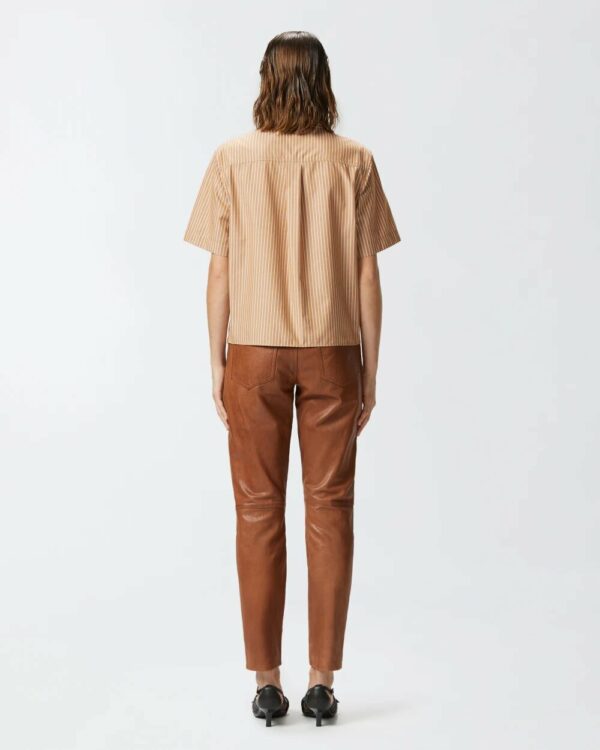 Camicia bowling da donna in tessuto popeline di puro cotone tinta in filo con fantasia a righe verticali bicolore. La camicia a maniche corte è un capo perfetto da abbinare ai nuovi pantaloni primaverili, per dare alle tue giornate in ufficio e ai tuoi momenti liberi un twist originale e caratteristico. Il colletto a punta è completato da fila di piccoli bottoni in metallo, parzialmente visibili grazie alla particolare costruzione del cannoncino.