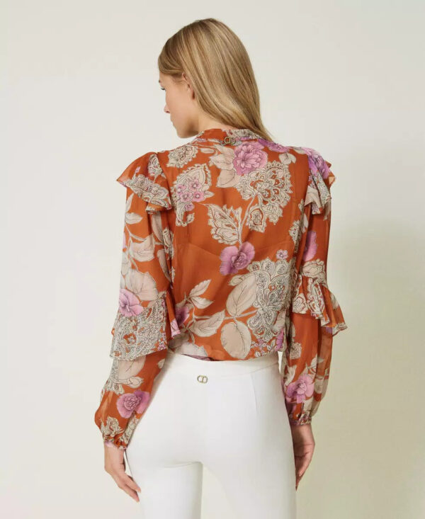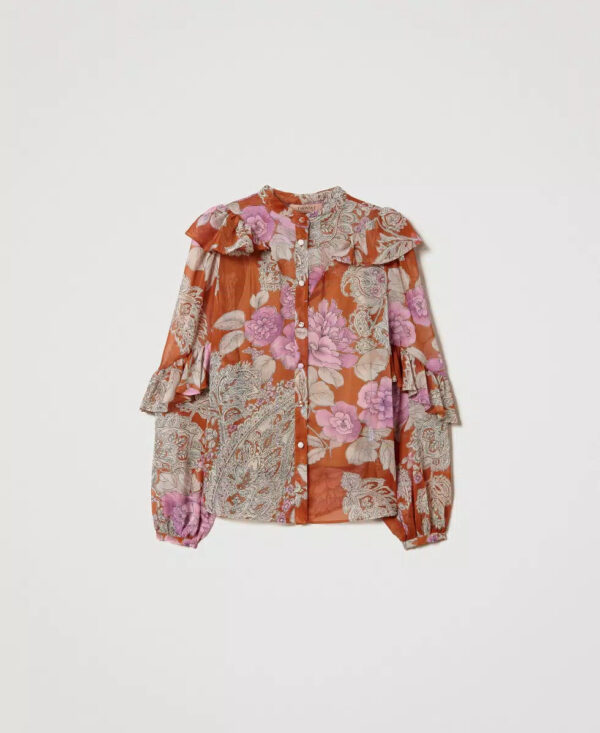 Camicia in creponne con stampa all over cashmere e rose, con volant sulle spalle, collo alla coreana, top abbinato.