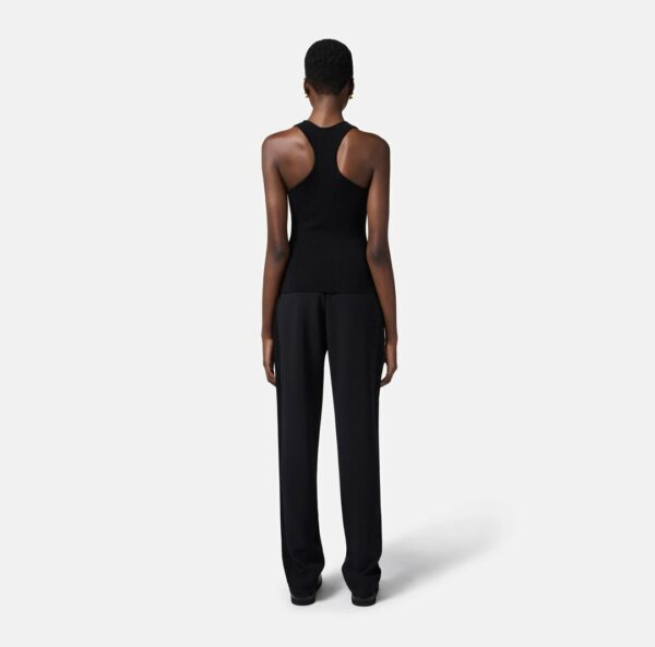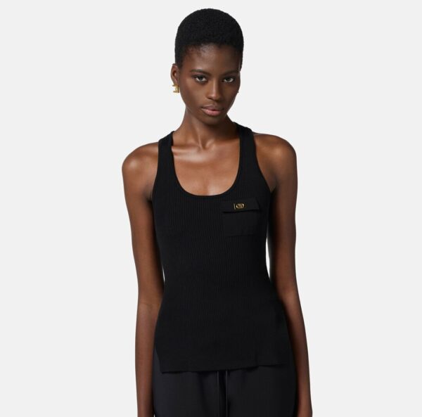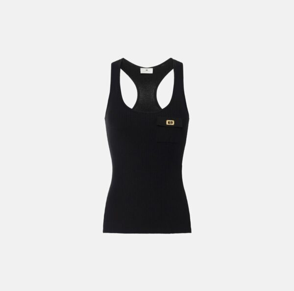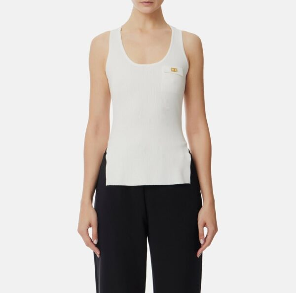 Canotta in misto lyocell e seta, lavorata a micro costine con schiena a vogatore. Il taschino è illuminato da una piccola placca in metallo dorato con logo. Vestibilità aderente.