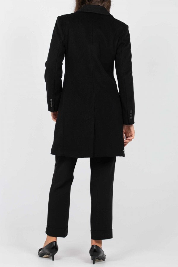 Cappotto in velour misto lana, linea semiaderente. Collo a rever, maniche lunghe. Chiusura con bottoni a vista, tasche a filetto. Spacco centrale sul retro. Foderato.