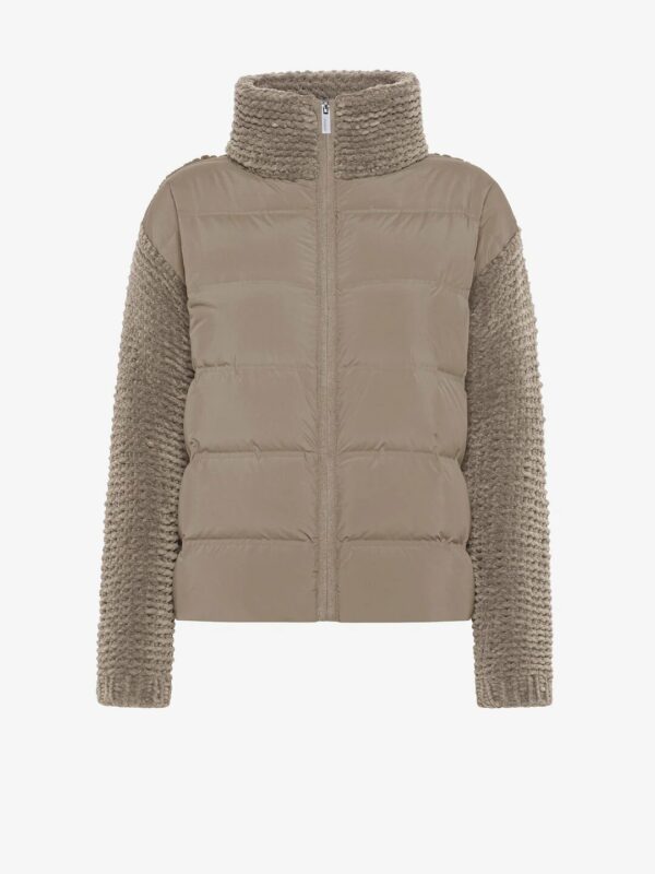 Iconica e distintiva, questa maglia hybrid dal design innovativo rappresenta un perfetto equilibrio tra stile e funzionalità. La parte frontale presenta la nitida texture a canali tubici senza impunture, che racchiudono l'imbottitura in piuma d'anatra 90/10. Questa si fonde con eleganza al retro e alle maniche in ciniglia a punto links, materica e avvolgente. Leggera e sorprendentemente versatile, la creazione si distingue per il taglio boxy, arricchito da un collo alto e strutturato, pensato per offrire comfort e definizione. Indossata con un pantalone flare, crea un look dinamico e contemporaneo, perfetto per affrontare la stagione con stile deciso e sofisticato.