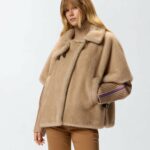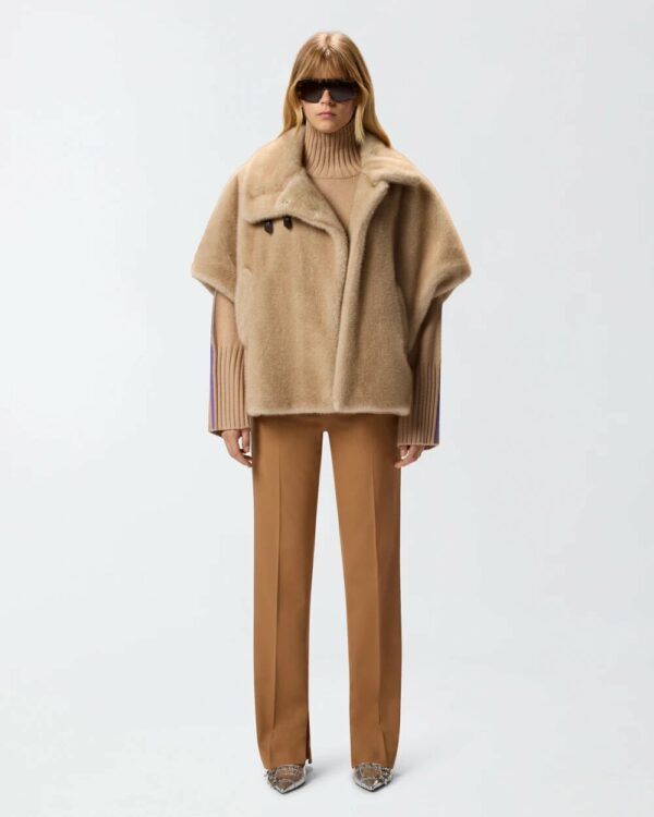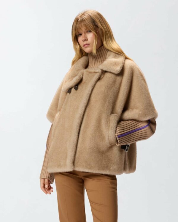 Cappa corta con maniche corte, tasche a filetto, avvolgente collo ripiegato e chiusura frontale decentrata. Il capo è realizzato in morbido tessuto Aspen dall'effetto pelliccia, particolarmente piacevole al tatto. Modello foderato. Il capospalla è ideale per accompagnarti nelle giornate più fresche di inizio stagione all'aperto, con il massimo comfort, senza rinunciare a un tocco di stile.
