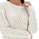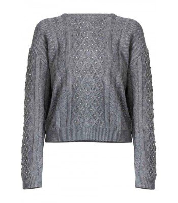 Una pioggia di punti luce scintillanti impreziosiscono questa maglia della capsule Pure Verve caratterizzata da una lavorazione a trecce e rombi. Questo capo presenta scollo rotondo, bordi a costine e giromanica sceso.