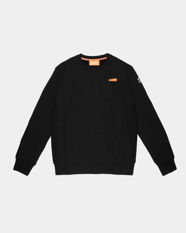 Felpa con cappuccio con logo SUNS sul braccio sinistro e pinnetta fluo ad altezza cuore sul fronte. La massima versatilità e vestibilità è garantita da inserti laterali, dagli orli delle maniche e dal fondo capo in costina elasticizzati. La linea classica e semplice, caratteristica distintiva del marchio, regala un capo intramontabile ed adatto ad ogni occasione.