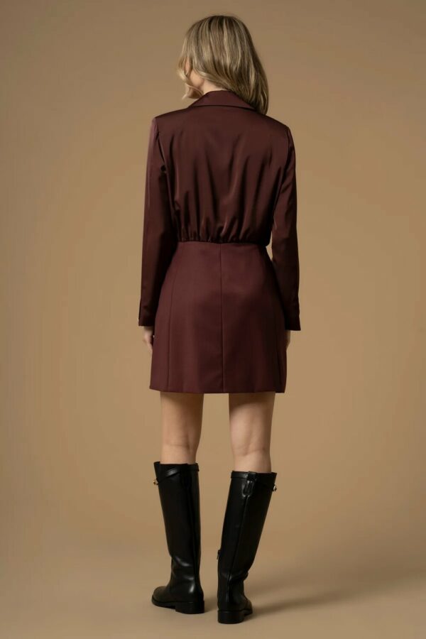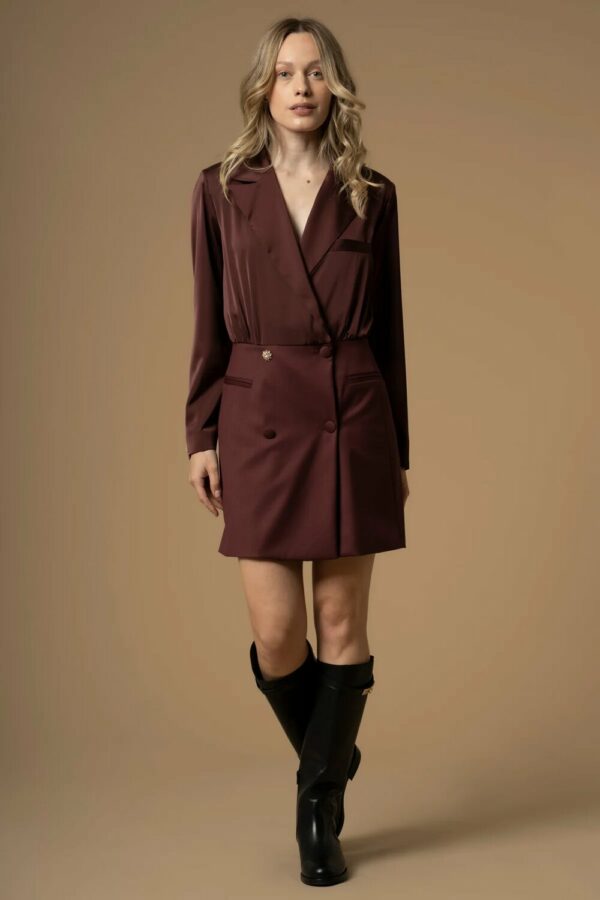 Stile ed eleganza per questo abito blazer caratterizzato da revers classici, tasche a filetto, bottoni in tessuto sul davanti, e impreziosito da un piccolo bottone gioiello.