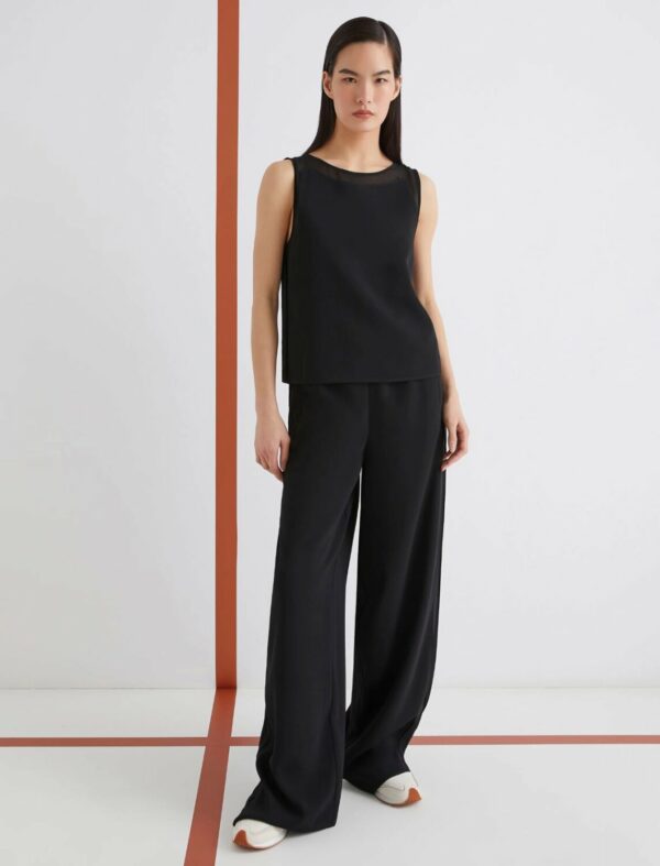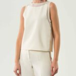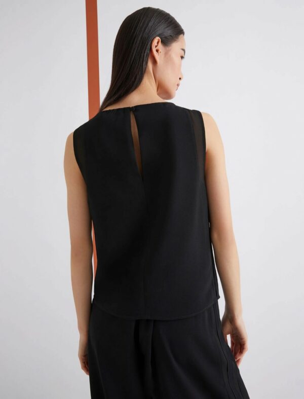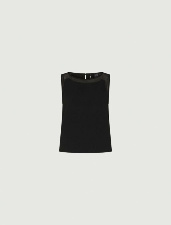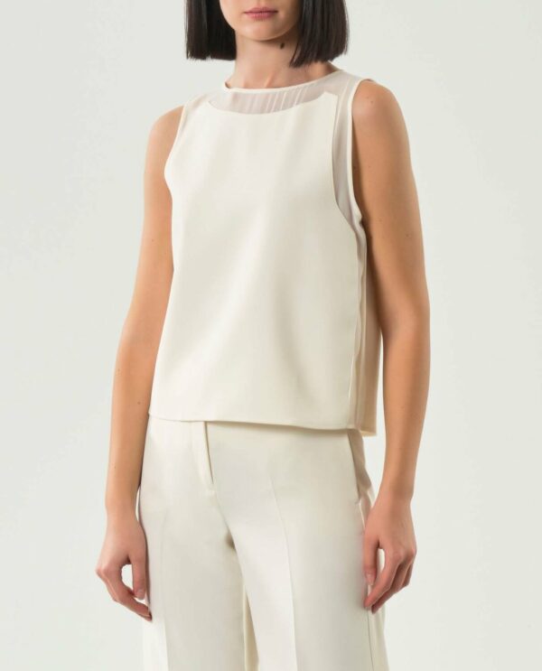 Top smanicato dalla linea femminile, arricchito dalla sensualità della georgette applicata su scollo e giro manica. Un mix materico sofisticato, da indossare con pants fluidi o con i denim preferiti.