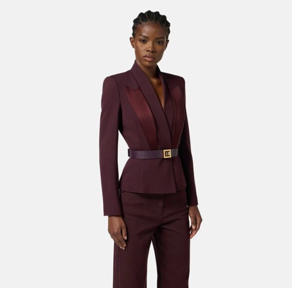Giacca in crêpe dalla vestibilità slim. Il blazer ha collo sciallato e si distingue per il doppio rever realizzato in raso, intarsiato e in tono per creare interessanti contrasti di texture. La baschina con cintura in vita regala una silhouette decisa e armoniosa.