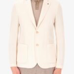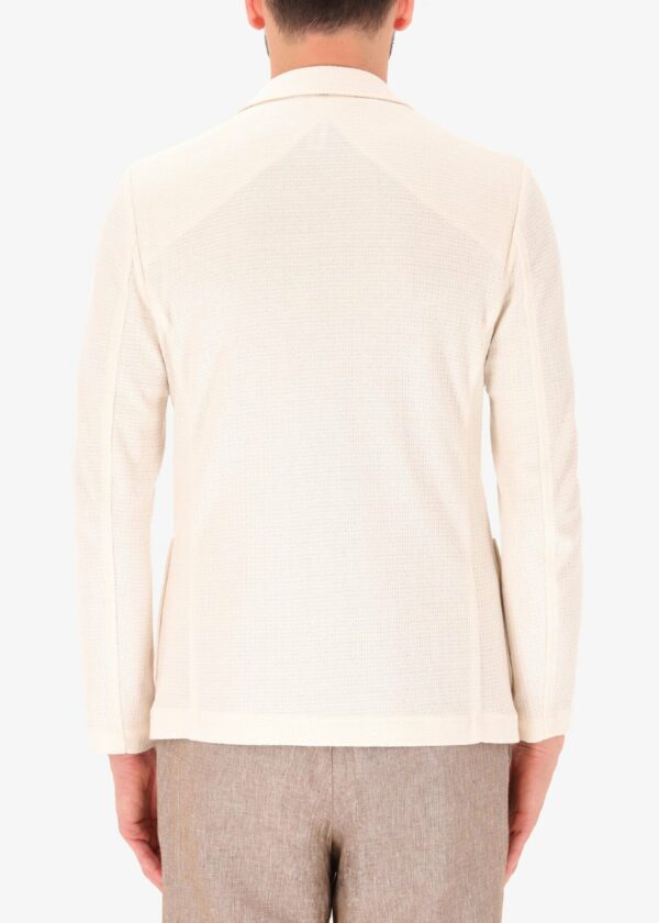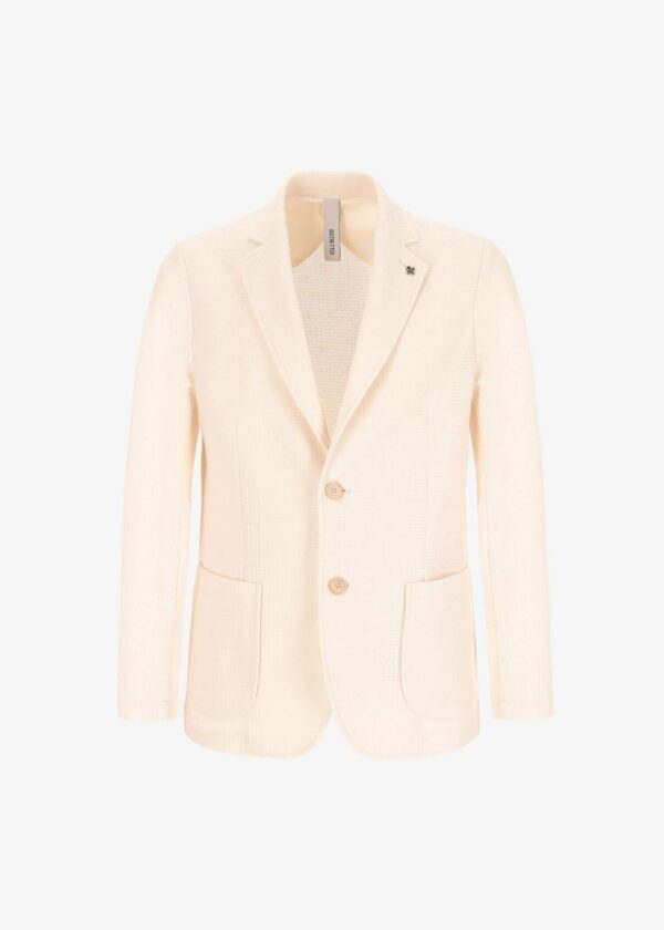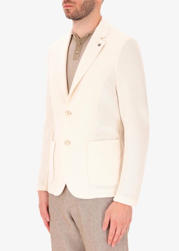 Giacca monopetto in tessuto maglia jersey unito super stretch. Il capo presenta una abbottonatura frontale a due bottoni e delle tasche frontali a toppa. Linterno è sfoderato con bordi in sbieco di cotone ed una tasca in tessuto a contrasto.