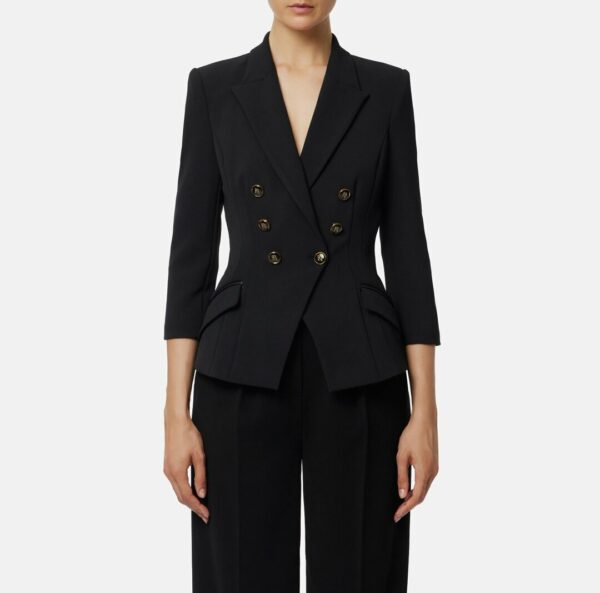Giacca in doppio crêpe dalla vestibilità slim. Il blazer ha spalle strutturate, rever a lancia, maniche ¾, patte con filetti in tono. Le zip al fondo manica regalano dettagli inediti, i bottoni smaltati impreziosiscono il capo. Parte della collezione Essential, per costruire il guardaroba perfetto.