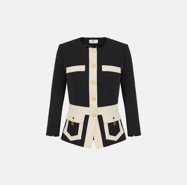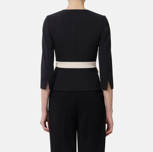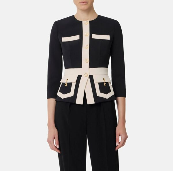 Giacca in doppio crêpe dalla vestibilità slim. Con spalle strutturate, scollo rotondo, maniche ¾ e chiusura con bottoni smaltati, si distingue per i dettagli in colore a contrasto che creano un raffinato color-block. I gemelli pendenti con catena aggiungono un dettaglio luminoso.