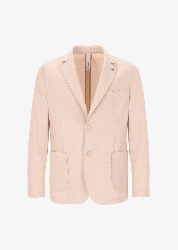 Giacca in tessuto di jersey super comfort con micro disegno. Il capo presenta una abbottonatura a due bottoni frontale, delle tasche frontali a toppa ed un taschino alto a pistagna. Linterno è sfoderato con bordi in sbieco di cotone ed una tasca interna in contrasto.