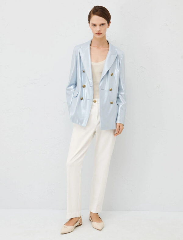 Blazer doppiopetto in morbido jersey laminato dall'allure fashion. Perfetto in match con i pantaloni abbinati.