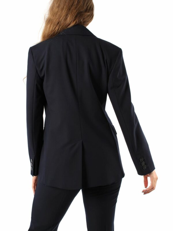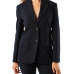 Giacca blazer monopetto in tela bielastica misto viscosa, colore blu. Modello con collo a rever, chiusura con un bottone, tasche a filetto laterali e maniche lunghe. Linea aderente e confortevole, ideale per un look professionale e raffinato. Collezione Marella.