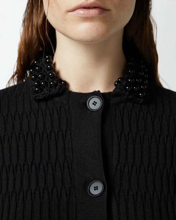 Piccola giacca dal taglio corto in maglia di misto lana lavorata con un particolare tipo di punto che crea una texture geometrica d'effetto. Il capo è completo di colletto a camicia realizzato in maglia di cotone all'uncinetto impreziosito con perle in tono colore applicate, rimovile con piccoli bottoni sia per poter indossare la giacca senza colletto, se desiderato, sia per un lavaggio più facile e sicuro. Il volume aderente della giacca è completato da maniche lunghe, logo PINKO nel centro dietro intarsiato a contrasto di colore e chiusura monopetto con bottoni.