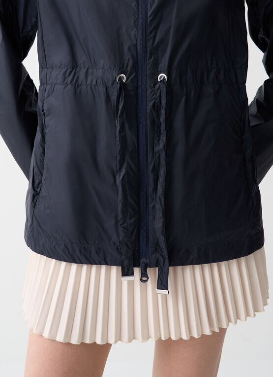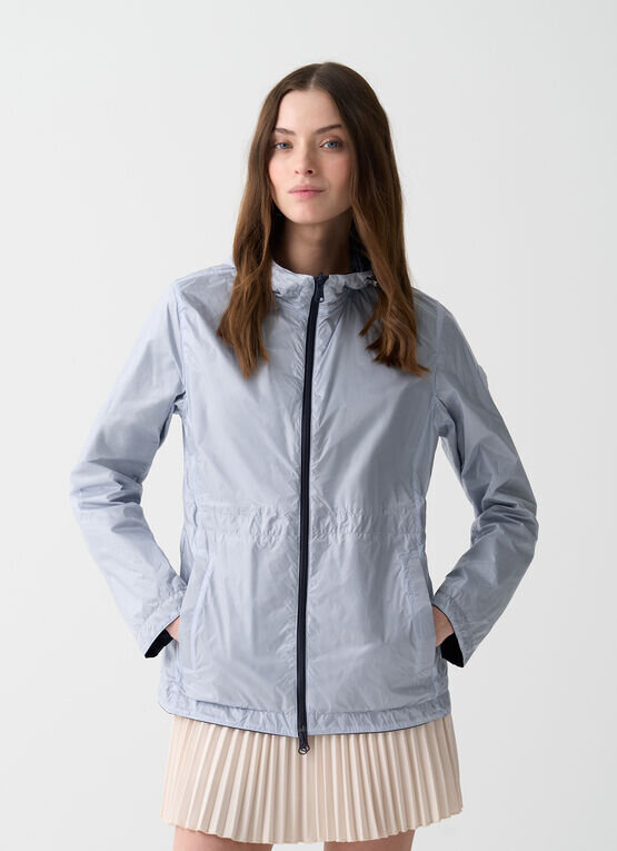 Giacca reversibile da donna con cappuccio, realizzata in tessuto 100% riciclato super leggero e idrorepellente. Due capi in uno da poter abbinare al meglio al proprio outfit in base al colore che si preferisce. La coulisse in vita permette di regolarne l'ampiezza e rende questo capo molto femminile.