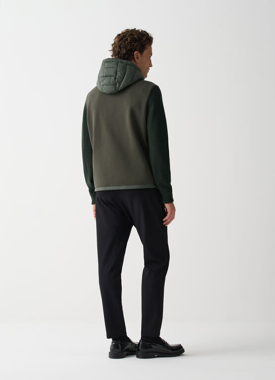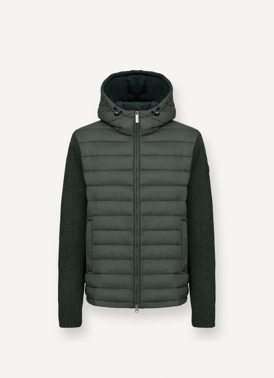 Per un look dinamico, la giacca trapuntata con cappuccio e maniche a costine da uomo combina stile e comfort, perfetta per fresche giornate autunnali.