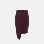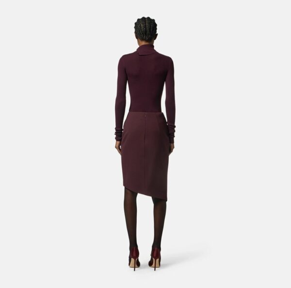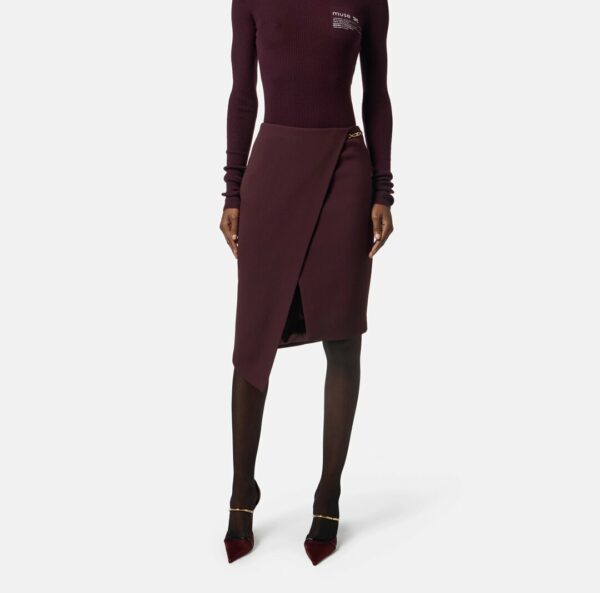 Gonna a tubino in crêpe dalla vestibilità slim. Si distingue per la costruzione con pannello asimmetrico ed è impreziosita su un fianco dal dettaglio gioiello in metallo dorato con logo e strass.